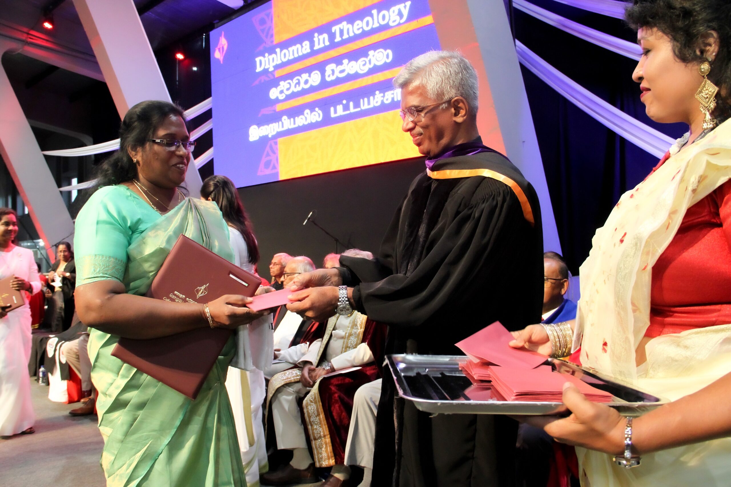 An awardee of the Certificate in Christian Studies from Jaffna study centre being congratulated by the Principal.