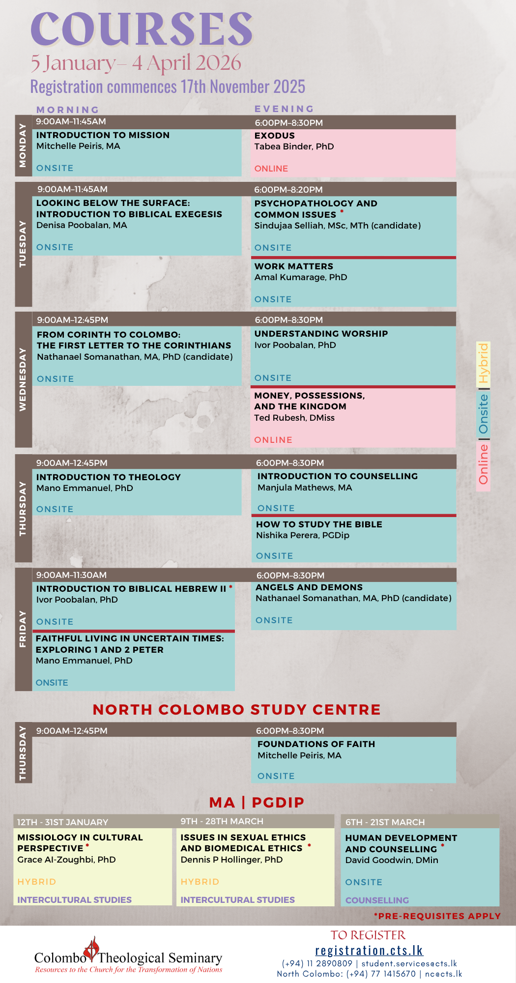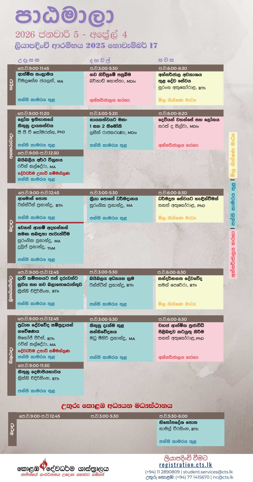 On Site | Online | Hybrid Check below for more information on the English, Sinhala and Tamil Courses. Registration Inquiries: (+94) 11 2890809 English Courses Course Catalogue Sinhala Courses පාඨමාලා නාමාවලිය Tamil Courses பாட நெறி வழிகாட்டி General Information තොරතුරු பொதுவான தகவல்கள்